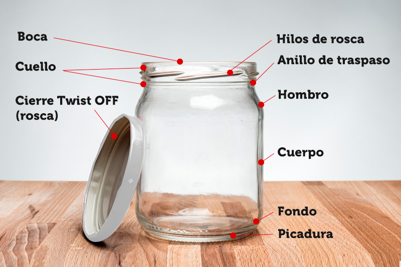 Las partes básicas de un envase de vidrio son: la boca, el cuello, el hombro, el cuerpo, el talón, el fondo y la picadura (la superficie de forma cóncava que se encuentra en el interior del tarro).